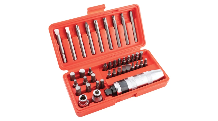 Ipari minőségű ütvecsavarhúzó irányváltós csavarozó mechanizmussal Amikor az ütésálló nyelet kalapáccsal megütjük a lefelé ható erőt a csavarhúzó belső mechanizmusa erős forgónyomatékká alakítja át Ideális rögzítőelemek végleges meghúzásához illetve beragadt rögzítőelemek meglazításához A hatszög meghajtójú orr-rész eltávolítható így a 1 2 négyszög meghajtó közvetlenül használható erősített dugókulcsokkal Szerelő csavarhúzó bit készlet 1 2 négyszög x 5 16 hatszög bit adapter 1 2 négyszög x 3 8 hatszög bit adapter 80mm x 3 8 hatszög bitek Hatszög 8mm 6mm TX Tx40 Tx45 Tx50 Kereszthornyos No 2 No 3 Hornyos 8mm és 10mm 35mm x 3 8 hatszög bitek Hatszög 4mm 5mm 6mm 7mm 8mm TX Tx20 Tx25 Tx30 Tx40 Tx45 Tx50 Kereszthornyos No 1 2 3 és 4 Hornyos 5mm 6mm 8mm 10mm 12mm 30mm x 5 16 hatszög bitek Hatszög 10mm 12mm TX Tx55 XZN 5mm 6mm 8mm 10mm és 12mm