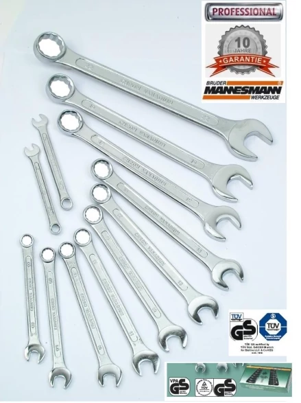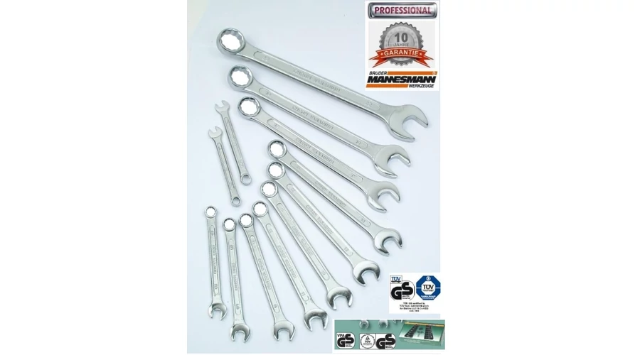 JELLEMZŐK: 10 ÉV GARANCIA TÜV/GS DIN 3113 certifikációval Német MANNESMANN DIN3113 CV professzionális 10 év garanciával, polírozott fejjel. 12db: 6-22mm GaBel-riNGSchlüSSelSaTz, aus Chrom-Vanadium Stahl, TÜV / GS - geprüft, gemäß DIN 3113 8-teilig, 8 - 19 mm, verchromt polierte Köpfe