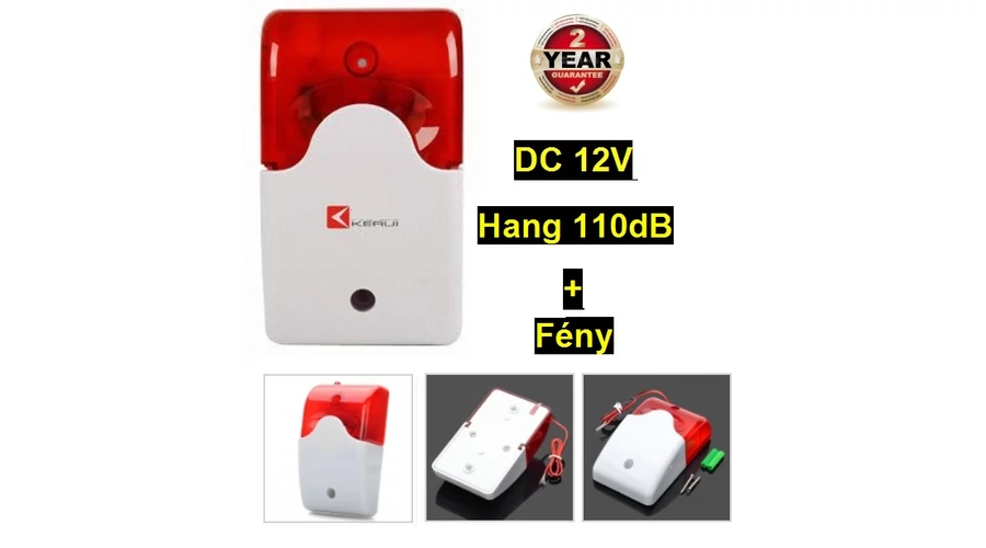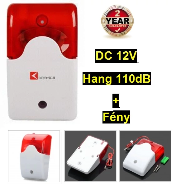 JELLEMZŐK: 2 év garancia Vezetékes villogó sziréna riasztó rendszerekhez ( vezetékes illetve vezeték nélküli rendszerekhez egyaránt beköthető). 1) szirénázás + piros villogó fény 2.) Kompatibilis minden riasztóberendezéshez 12V-ig ( 12V alattihoz javasolt relézni ) Műszaki adatok: 1) Riasztás hangereje: 110dB 2.) villogás / min: 150 alkalommal 3) Névleges áram: 300 mA 4) Tápegység: DC12V 5) Méret: 120mm x 70mm x 45mm 6/ Tartozékok: bekötött vezeték kb 30cm, facsavarok, tiplik Működés: Csatlakoztassa a vezetékes szirénát a főegységhez. Ha a főegység elindítja a riasztást, a sziréna elindul.