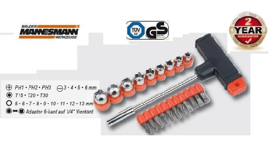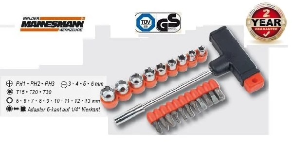 JELLEMZŐK: 2 év garancia TÜV/GS certifikated T fogós csavarhúzó és dugókulcs klt. 22-részes Mit Bits und 6,3 mm (1/4")-Einsätzen Ausstattung Mit 11 Bits, 9 Steckschlüsseleinsätzen 6,3 mm (1/4"), 1 Adapter und T-Griff. Lieferumfang Kreuzschlitz PH 1/2/3 Schlitz 3/4/5/6 mm T-Profil T15/T20/T30 Außensechskant 5/6/7/8/9/10/11/12/13 mm Innensechskant Adapter 6-kant auf 6,3 mm (1/4").
