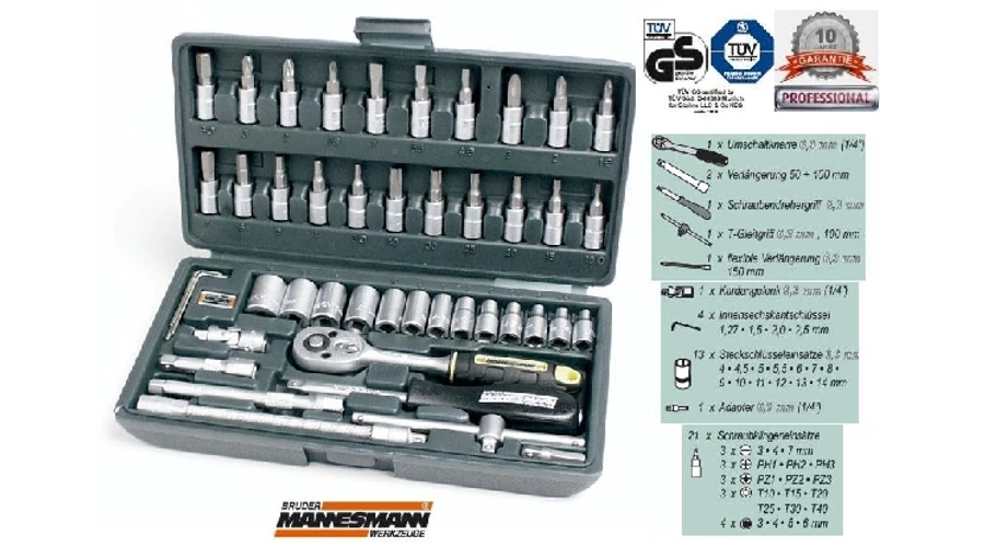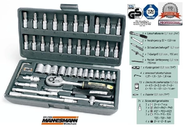 JELLEMZŐK: 10 év garancia TÜV/GS certifikációval. Minőségi termék a 80 éves legendás német MANNESMANN WERKEZEUGE "Green Line" ipari minőségű TÜV-GS + DIN-ISO, professzionális kategóriájából 10 év garanciával. Ipari kategóri: praktikus 1/4" 46db-os CROVA készlet kofferben Mannesmann Steckschlüsselsatz 1/4", Super Lock System, 46-teilig STECKSCHLÜSSELSATZ, CV Stahl 1/4", 46-teilig Inhalt: *1 x Umschaltknarre 1"" *1 x Gleitgriff 1"" *1 x Kardangelenk 1" *1 x Verlängerung 1" 50 mm *1 x Verlängerung 1" 100 mm *1 x Verlängerung, flexibel 150 mm *1 x Schraubendrehergriff mit 1"" Innen,- und Außenaufnahme *13 x Steckschlüsseleinsätze 1"" 4/ 4,5/ 5/ 5,5 /6/ 7/ 8/ 9/ 10/ 11/ 12/ 13/ 14 mm *8 x Steckschlüsseleinsätze, 1"" lang 6/ 7/ 8/ 9/ 10/ 11/ 12/ 13 mm *4 x Innensechskantschlüssel 1,27/1.5/2/2,5 mm Steckklingeneinsätze 1" *6 x Innensechkant-Bits 3, 4, 5, 6, 7 und 8 mm *3 x Kreuzschlitz-Bits Nr. 1, 2, 3 *3 x Schltiz-Bits 4/ 5,5/ 7 mm *3 x Pozidrive-Bits Nr. 1, 2, 3 *6 x TX-Bits T-10, T-15, T-20, T-25, T-30, T-40"
