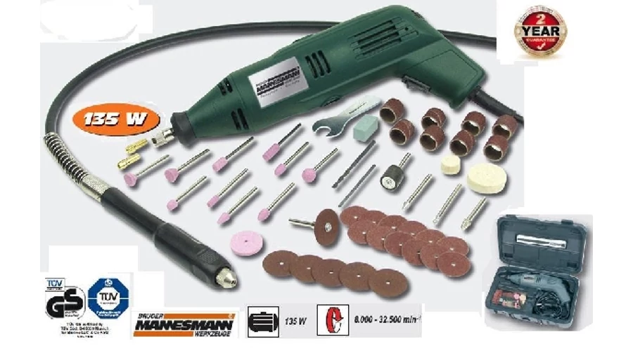 JELLEMZŐK: 2 év garancia TÜV/GS certifikációval. Minőségi termék a 80 éves legendás német MANNESMANN WERKEZEUGE-től, 2 év garanciával. Remek készlet, modellezőknek, barkácsolóknak, erős készülékkel ( 135W ) , sok tartozékkal. 50 db-os db-os erős ( 135W ) mini drill fúró köszörű gravírozó csiszoló polírozó készlet flexibilis toldó szárral, kofferben. Sokoldalú és praktikus eszköz a kisebb barkácsmunkákhoz, makettozáshoz panelfúráshoz, finommechanikai munkákhoz. Polírozás, csiszolás, gravírozás. A gép karcsú váza lehetővé teszi a maximális kontrollt és könnyű fogást bizosít fokozatmentes fordulatszám-szabályozás 8,000-30,000 rpm. 50 db-os fej köszörű, gravírozó készlet. (befogás: 3mm+egy darab 2,5mm befogópatron), műanyag kofferban, flexibilis szárral