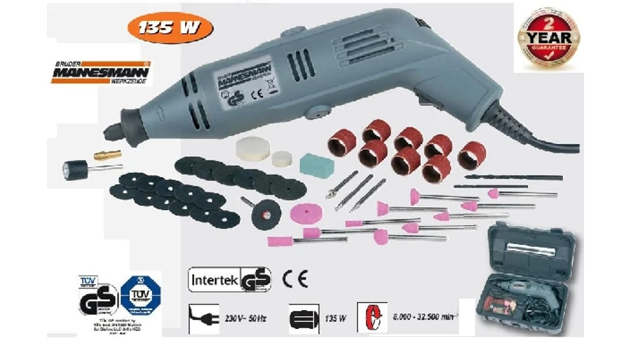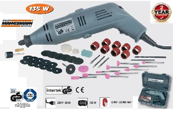 JELLEMZŐK: 2 év garancia TÜV/GS certifikációval. Minőségi termék a 80 éves legendás német MANNESMANN WERKEZEUGE-től, 2 év garanciával. Remek készlet, modellezőknek, barkácsolóknak, erős készülékkel ( 135W ) , sok tartozékkal. 50 db-os db-os erős ( 135W ) mini drill fúró köszörű gravírozó csiszoló polírozó készlet kofferben. Sokoldalú és praktikus eszköz a kisebb barkácsmunkákhoz, makettozáshoz panelfúráshoz, finommechanikai munkákhoz. Polírozás, csiszolás, gravírozás. A gép karcsú váza lehetővé teszi a maximális kontrollt és könnyű fogást bizosít fokozatmentes fordulatszám-szabályozás 8,000-30,000 rpm. 50 db-os fej köszörű, gravírozó készlet. (befogás: 3mm+egy darab 2,5mm befogópatron), műanyag kofferban,