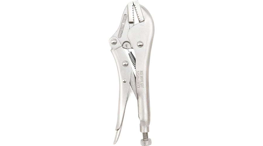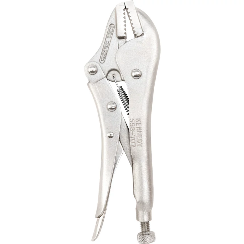 Króm-vanádium acél szerszámtest süllyesztékben kovácsolt edzettacél-pofák korrózióvédő fényes nikkelbevonattal A pofa szorítónyomása a recézett fejű csavar segítségével szabályozható a pofák nyitását rugóerő biztosítja A záró mechanizmus a beállított szorítóerővel zárva tartja a fogót szabadon hagyva a felhasználó mindkét kezét Egyenes pofa Általános célú szorításokhoz