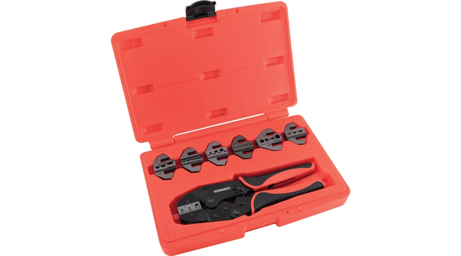 Cserélhet pofákkal ellátott saruzó készlet KRC07 7 Pofákkal kerül leszállításra Szigetelt terminál 0 5- 6 0mm2 Nem szigetelt terminál 1 5mm2 - 10mm2 Tekercs nyitott terminál 0 5 - 6 0mm2 Kábelvég terminál AWG kicsi 0 5mm2 - 4 0mm2 RG típusú koaxiális csatlakozó RG 58 59 62 and 6 6 48mm - 8 23mm Kábelvég terminál AWG nagy 0 5mm2 - 16 0mm2 Tekercs nyitott terminál 7 D-SUB V3 5 2 5mm2 - 8 0 - 10 0mm2 Könnyedén cserélhet pofákkal ellátott saruzó fogó az -n saruzási igyényeinek megfelel en Reteszelt préskerettel és állítható présnyomással -t cseréhet edzett és megeresztett karbonacél pofa kábelsarukhoz csatlakozókhoz cs hüvelyekhez és záróhüvelyekhez Ütésálló műanyag hordtáskában