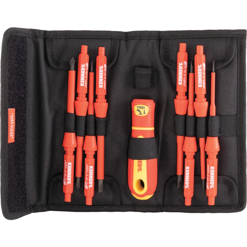 Ergonomikus teljes markolatú szigetelt nyéllel forgófejes nyéllel és nyolc cserélhető behajtófejjel kompakt kivitelű tartófülekkel ellátott védőtokban Biztonságos 1000V AC 1500V DC feszültségig