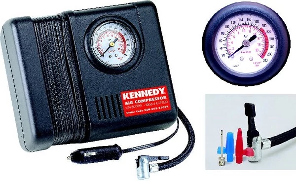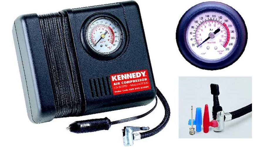 JELLEMZŐK: 2 év garancia Ipari és professzionális kategória: TÜV-GS + DIN-ISO 2 év garanciával . KENNEDY 12V légkompresszor. Mini méret, professzionális technológia. Gumiabroncsok, gumimatracok, csónakok, sporteszközök és bármilyen felfújható eszköz felfújására alkalmas. 3 m kábellel, 12 V gépkocsi szivargyújtó csatlakozóval, fúvókával és adapterekkel. A kettős skálájú mérőórán lb/in2 és kg/cm2 érték is leolvasható. 12V-os kompresszor autó- és motorkerékpár kerekek, sport és strandcikkek egyszerű felpumpálásához. A rendkívül hatékony 300PSI (21Bar) erősségű levegőáramoltatás lehetővé teszi akár buszok és teherautók abroncsainak felfújását is Szállítás tartalma Kompresszor, 4 adapter (labdához, autó-motorkerékpár abroncshoz, matrachoz, stb..), Jellemzők Automatikus túlterhelés védelem, jól leolvasható manométer, autókerekek felfújása kb 1 perc alatt, fröccsenő víz ellen védett. 600mm levegő tömlő Műszaki adatok Max. nyomás: 300psi = 21Bar (atm.) Üzemi feszültség: 12 V (szivargyújtó) Szivargyújtó Túlterhelés védelem Manométer 4 adapter Kompakt méret: 17x14x7cm