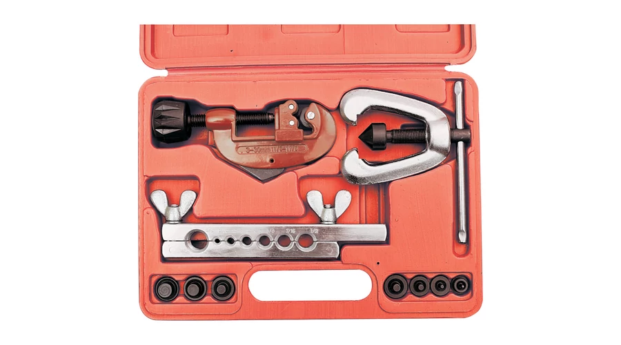 Csőperemező készlet 3/16", 1/4", 5/16", 3/8", 7/16", 1/2" és 5/8" külső átmérőjű acél, alumínium és réz csövekhez