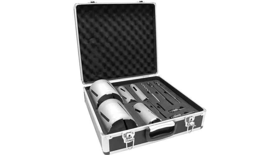 JELLEMZŐK: TÜV/GS DIN CE certifikált ipari felhasználású és kivitelű KOBE gyártmány. Alkalmas műhelymunkákra és könnyűipari alkalmazásokra. Ipari kivitel, minőségi termék 2 év garanciával. Szerszámacélból gyártott Core gyémántfúrók, mely tökéletes koncentricitást és jó hegesztési szilárdságot biztosít. Építőanyagok széles skálájánál alkalmazható, úgymint: klinkertéglák, betonblokkok, salaktéglák, falazóblokkok és puha-közepes keménységű természetes kövek. Ideális vízvezeték, elektromos, gépészeti szerelési és általános építési feladatokatnál. A készlet tartalmazza az 5. leginkább használatos méretet Profeszionális fém kofferben szállítjuk. A készlet tartalma: 42, 52, 65, 117 és 127 mm magfúró. Tokmány átalakító, tokmány hosszabbító, SDS átalakító, SDS hosszabbító, vezetőrúd, kúpos fúró vezető, kiütőcsap.