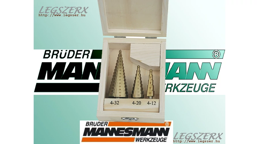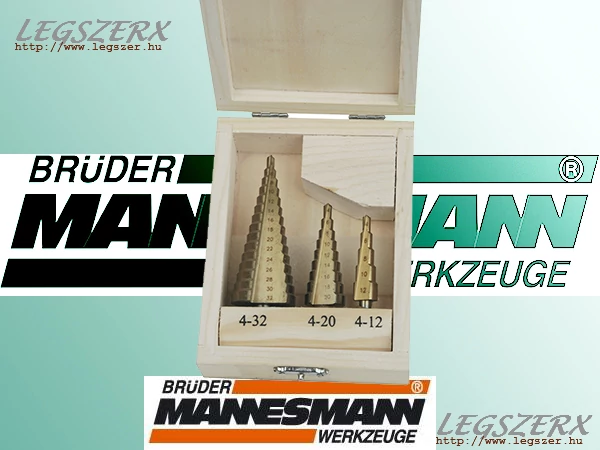 MANNESMANN 3 RÉSZES TITÁN BEVONATÚ LÉPCSŐS FÚRÓ KÉSZLET ACÉLLEMEZHEZ Előfúrás nélkül alkalmazható. Fixen tartó fa dobozban. 4-32mm 4-20mm 4-12mm