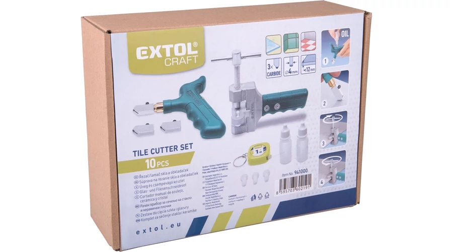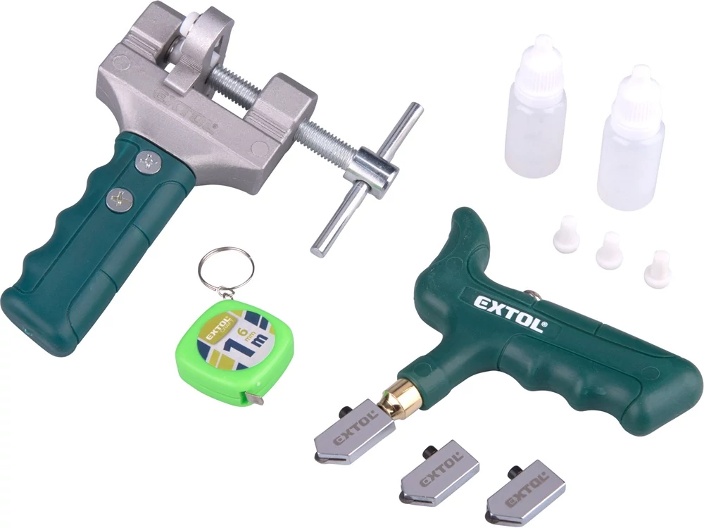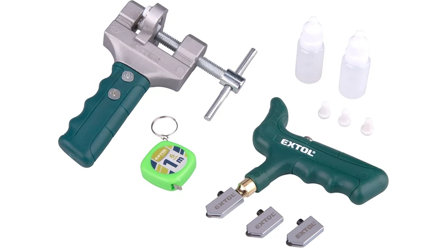 1 db T alakú nyél, 3 db keményfém görgős vágófej, 1 db törő, 2 db olajtartály, 3 db műanyag távtartó elem, 1 db mérőszalag (1 méteres)