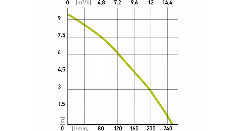 2) Minél nagyobb a nyomási magasság, annál kisebb a nyomott víz mennyisége. A maximális áramlási értékeket (nyomott víz mennyiséget) ideális feltételekhez határoztuk meg (kizárva az áramlást csökkentő tényezőket). Az áramlás/nyomási magasság függ a nyomóoldali tömlő hosszától is (10 méter nyomoldali tömlő 1 m-es nyomási magasságnak felel meg). Az áramlás értékére hatással vannak egyéb tényezők is, például a tömlőcsatlakozók, szórófúvókák, mivel ezek belső átmérője kisebb, mint a tömlő belső átmérője. Az áramlás értékére hatással van a tömlő belső átmérője is.