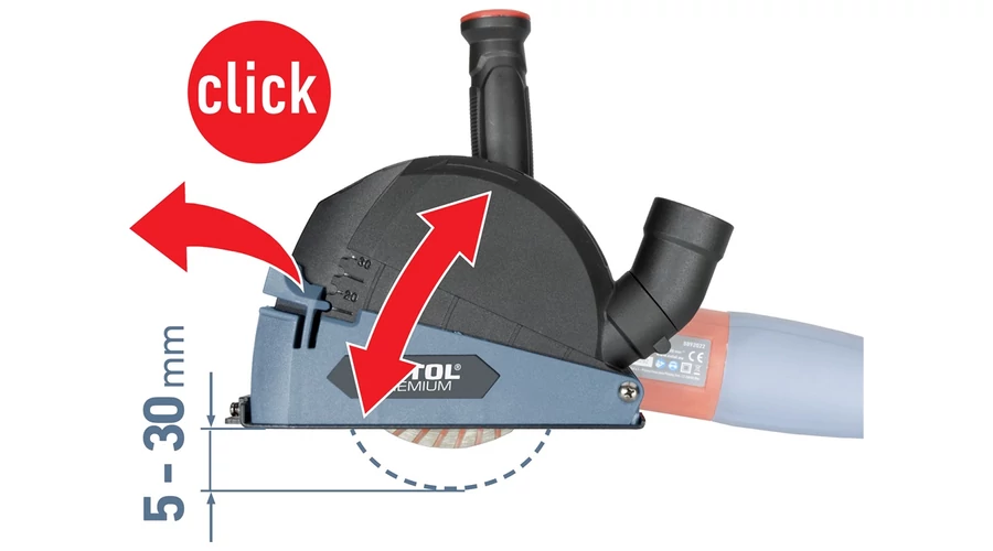 univerzális méret: 115 mm (vágási mélység: 5 - 25 mm) és 125 mm (vágási mélység: 5 - 30 mm) tárcsákhoz is használható