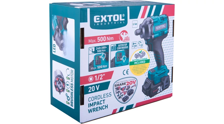 Az Extol® Industrial 8791814 akkus ütvecsavarozóhoz 2 Ah kapacitású Li-ion akkumulátor (8891881), és 2,4 A töltőáramú akkumulátortöltő (8891893) is tartozik. ü Az Extol® Industrial 8791815 akkus ütvecsavarozót akkumulátor és akkumulátortöltő nélkül forgalmazzuk, így kedvező áron vásárolható meg a készülék, ha a vevőnek már van más, tőlünk származó SHARE 20 V-os akkus készüléke, kompatibilis akkumulátorral és akkumulátortöltővel.