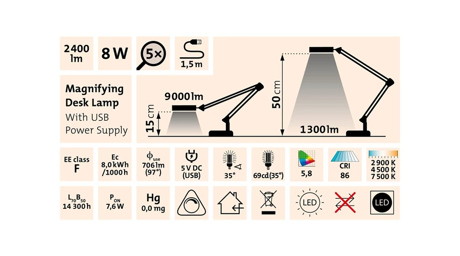 3 fokozatban állítható színhőfok: 7500K hideg fehértől - 4500K semlegesen át - 2900K meleg sárgás fényig.