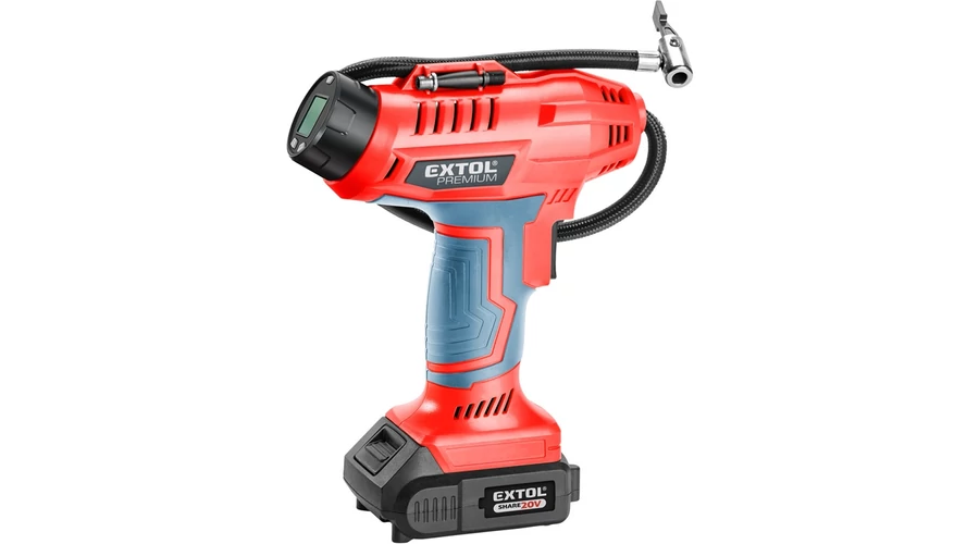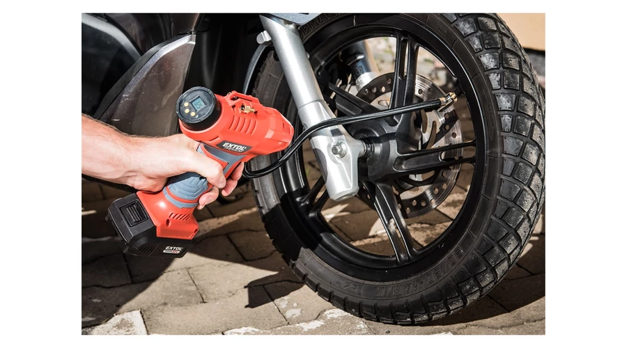 Erőteljes és nagy teljesítményű lítium-ion akkumulátoros kompresszor, amelynek célja a személygépkocsik és haszongépjárművek, motorkerékpárok és kerékpárok gumiabroncsainak nyomásának az ellenőrzése és növelése, valamint a mellékelt tartozékokkal a sportlabdák, ágyak, matracok stb. A kompresszor kijelzőjén kiválasztható a nyomás bar, psi, kPa értékben, és a kompresszor automatikusan leáll, amikor ezt az értéket eléri. Amennyiben a gumiabroncsból ki kell engedni a nyomást, akkor a szelep csatlakozó kart hajtsa fel, a csatlakozón keresztül levegő áramlik ki a gumiabroncsból. Sötétben végzett munkához munkaterület megvilágító LED-el és a kijelző háttérvilágítással rendelkezik. Automata kikapcsolás (10 perc után). Maga a kompresszor a gép belsejében teljesen fémből készült, hosszú élettartamot biztosít.