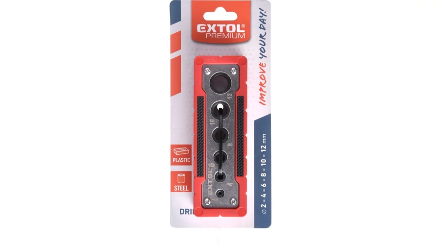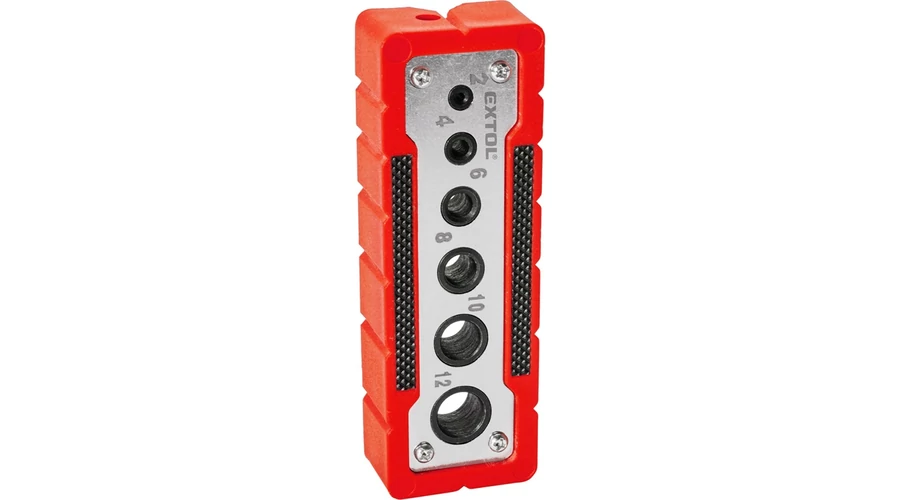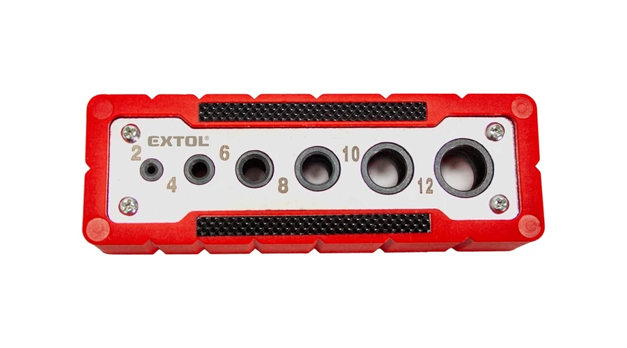 Műanyag ház, 6 db rozsdamentes acél megvezető hüvely: 2 - 4 - 6 - 8 - 10 - 12 mm fúrószárakhoz.