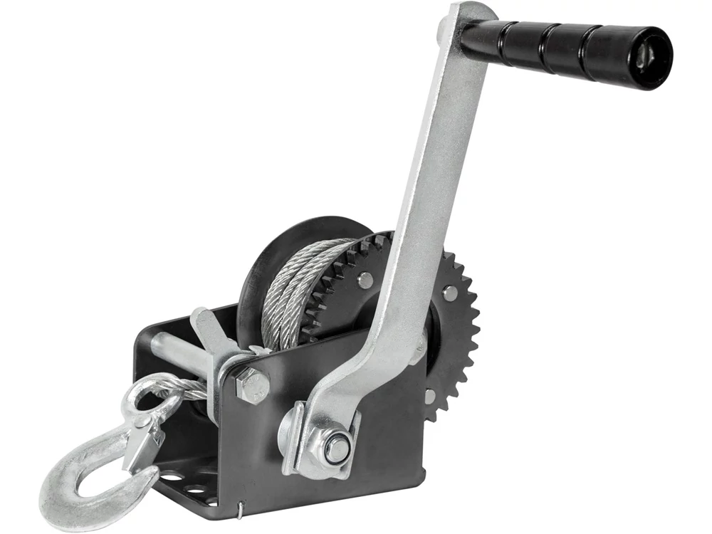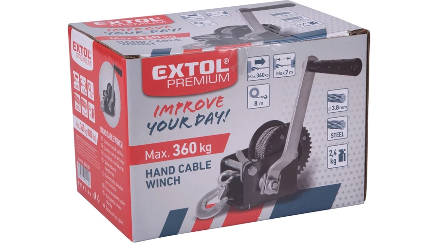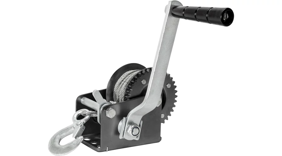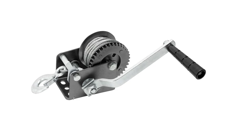 Max. terhelés: 360kg. 1 sebességes modell, 1 áttételezési aránnyal, horoggal és talppal, amely az előre elkészített furatokon keresztül bármilyen pozícióban rögzíthető. Sodrott acél drótkötél 3,8 mm × 8 m (kb. 7 m használható). Saját tömeg: 2,4 kg. EK megfelelőségi nyilatkozat a felhasználói kézikönyvben!