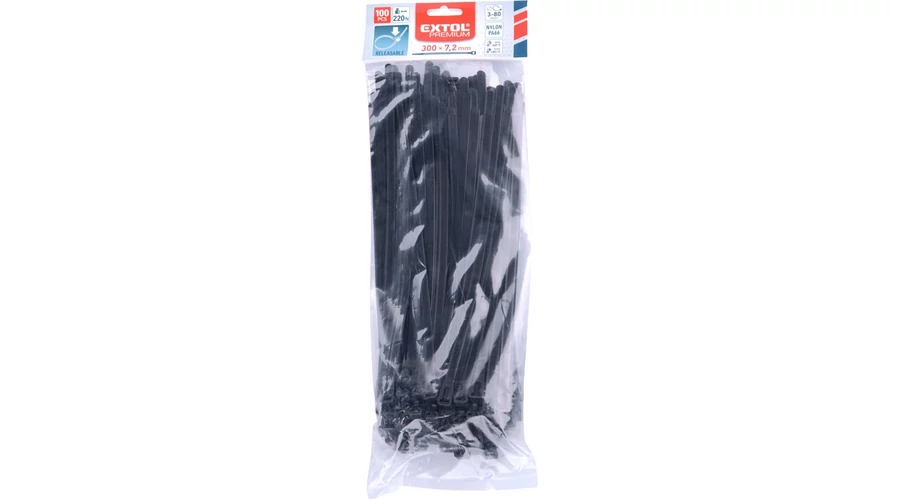 Húzószilárdsága 22kg; sav- és lugálló. Használható: -40°C és +85°C között; anyaga nylon 66; teljesíti az EN 62275 biztonságra és szilárdságra vonatkozó szabványt, tűzvédelmi osztály UL94V-2; kábelek, vezetékek és egyéb, nemcsak villanyszerelési anyagok gyors kötegeléséhez és rögzítéséhez.