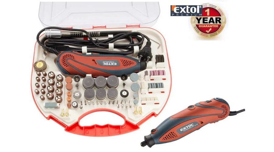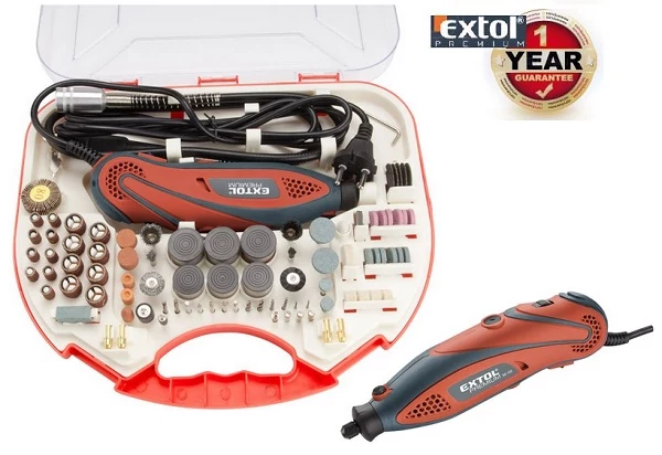 JELLEMZŐK: 1 év garancia EXTOL Premium 8892201 készlet, modellezőknek, barkácsolóknak, erős készülékkel 130W sok tartozékkal. 210 db-os erős ( 130W ) mini drill fúró köszörű gravírozó csiszoló polírozó készlet kofferben. Sokoldalú és praktikus eszköz a kisebb barkácsmunkákhoz, makettozáshoz panelfúráshoz, finommechanikai munkákhoz. Polírozás, csiszolás, gravírozás. A gép karcsú váza lehetővé teszi a maximális kontrollt és könnyű fogást bizosít. Ajánljuk finom csiszoláshoz, sorjátlanításhoz, maráshoz, gravírozáshos, polírozáshoz és finomfúráshoz, különféle fa, fém, üveg és műanyag munkadarabok megmunkálására. Műszaki információk: Névleges feszültség: 230 V ~ 50 Hz Névleges teljesítmény: 130 W Szabályozható fordulatszám: 10.000-32.000/min Tartozékok: 210db-os fej klt. csiszoló, polírozó, fúró, vágó stb. (befogás: 1,6mm +2,3mm x2 +3,2 mm befogópatron) Műanyag kofferban Flexibilis szárral Tömeg 0,67 kg