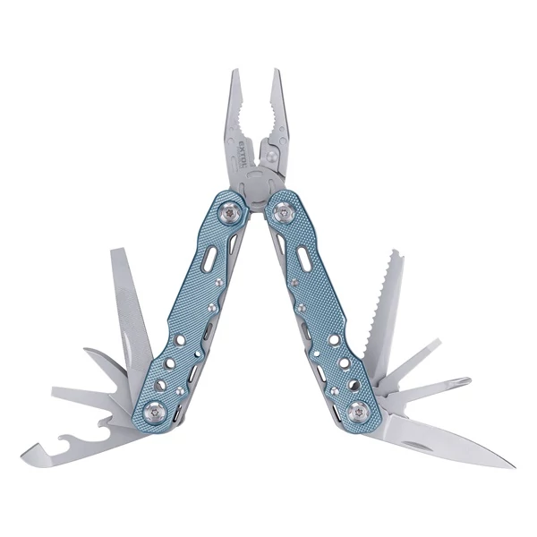11 funkció: kombinált fogó, késpenge, lapos+PH csavarhúzó, fűrész, reszelő, konzervbontó, stb.