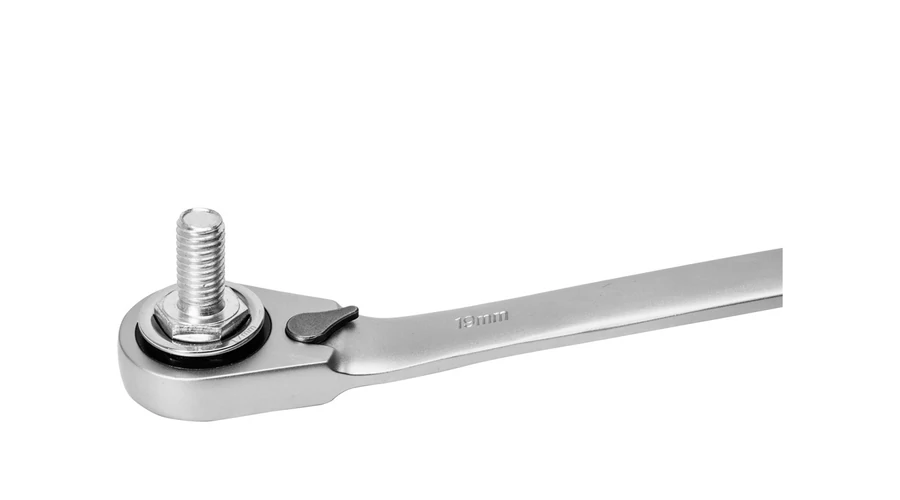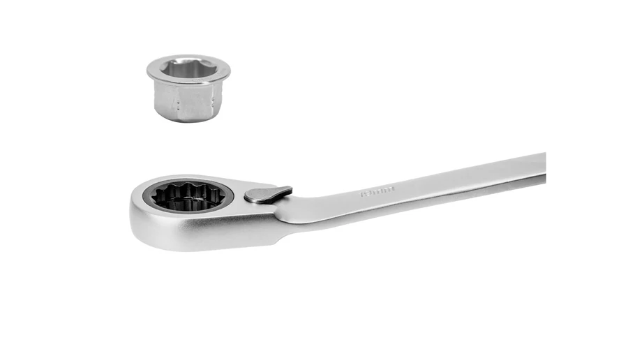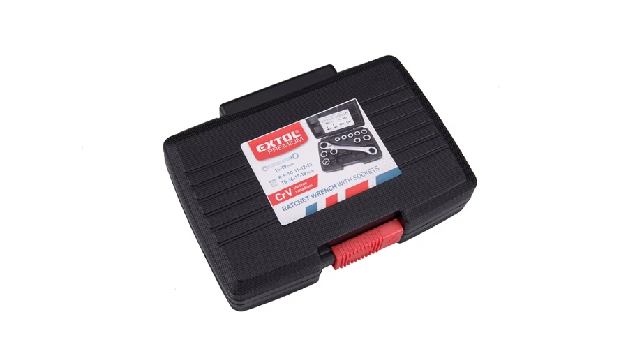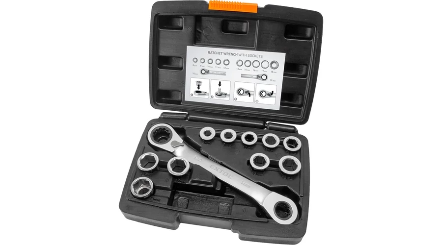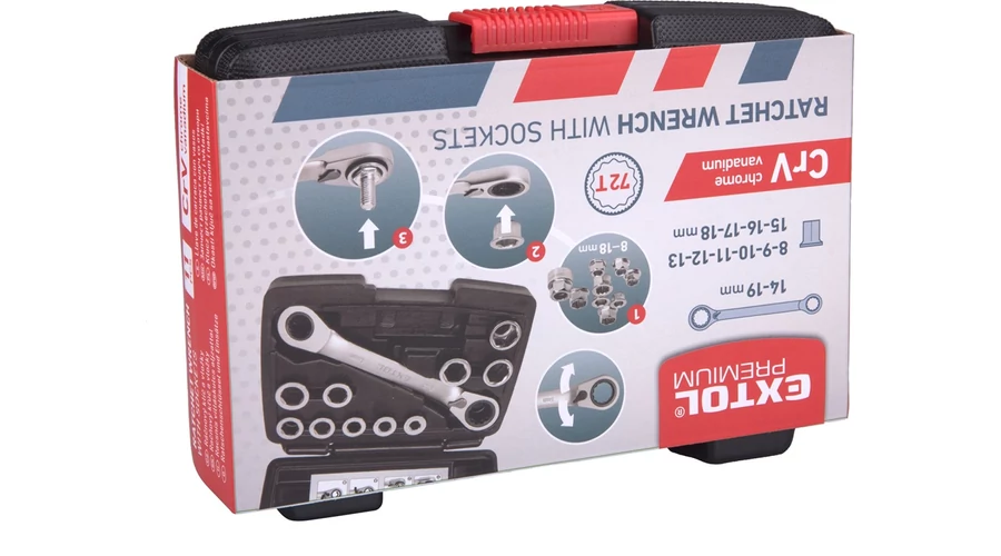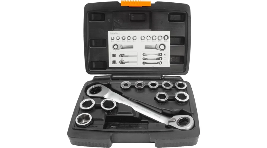 A 72 fogas racsnis mechanizmus finomabb munkavégzést tesz lehetővé, mindössze 5° a munkaszög. Praktikus megoldás: 1 db kulcs irányváltóval és 10 db egyszerűen cserélhető betét. Cserélhető racsnis kulcs betétek: 8-9-10-11-12-13-14-15-16-17-18-19 mm. Műanyag koffer a könnyű szállítás és tárolás érdekében.