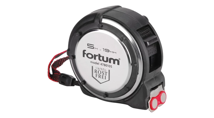 FORTUM mérőszalag, 1 stoppos, ütésálló, rozsdamentes acél ház, gumírozott; 5m×19mm nylon bevonatú szalag, mágneses vég FORTUM (4780105)