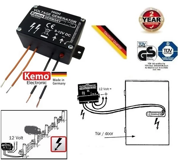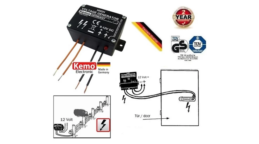 JELLEMZŐK: Német KEMO M062 nagyfeszültségű generátor modul. Kisebb, házkörüli területre, pld kutyakerítésnek, kisebb testű háziállatok kerítéstől való távoltartására, és betörésvédelemre ( ajtóvédelemre kilincs) DC 12V-os feszültségből szaggatott, kb. DC1000V-os 0,5 joule, 0,2m nagyfeszültség előállítására képes. Az áramkört 9-13,8V egyenfeszültséggel kell működtetni, hálózati adapterről, vagy akkumulátorról. Hatótávolsága 100m, max 150 méter, 1mm belső átmérőjű huzallal. Rövid, erőteljes, kb. 1000V os nagyfeszültségű impulzusokat állít elő. Használható objektumvédelemre, ajtókilincsbe is bevezethető vagy pulzáló nagyfeszültséggel való kísérletekhez, mert a pulzusok energiája kicsi (1000V-nál kb. 0,2mA) Műszaki adatok: tápfeszültség 12V, áramfelvétel 100-300 mA Impulzus frekvencia ca. 1 Hz-es (1 puls másodpercenként) Nagyfeszültségű kijelző LED-es Nagyfeszültségű kábel hossza max. 150 m (használat páros vezetékek, kábelek nem tartozék) szekunder: 2-4 pulzus/sec -feszültség: DC 1000V, áramerősség max. 0,2 mA, 0,5 joule. Modul méret: 70x50x42 mm, ami készreszerelt és bevizsgált modul Egy alapszintű rendszer kiépítéséhez az alábbi kiegészítők szükségesek: - HÁLÓZATI TÁPEGYSÉG 230/12V - vagy ZSELÉS ÓLOMAKKUMULÁTOR ( egyelőre nincs a kínálatunkban ) - VILLANYPÁSZTOR SZIGETELŐ GYŰRŰ ( egyelőre nincs a kínálatunkban ) - VILLANYPÁSZTOR SZIGETELŐ FACSAROS ( egyelőre nincs a kínálatunkban ) - FÖLDELŐ KARÓ ( egyelőre nincs a kínálatunkban ) - VILLANYPÁSZTOR VEZETÉK ( egyelőre nincs a kínálatunkban ) Figyelem! Az áramütés egyes betegségekkel küzdő személyekre káros lehet. Objektumvédelemnél figyelembe kell venni, és a szabványokat ismerő szakembertől tanácsot kell kérni. A villanypásztor kerítéseket jól látható helyeken figyelmeztető jelzéssel kell ellátni! Ha otthon védelemre akarja használni (pl. a kilincsekbe áramot vezetni), ehhez a rendőrség hozzájárulására is szükség lehet, és az esetleges sérülésekért Önt terheli a felelősség.