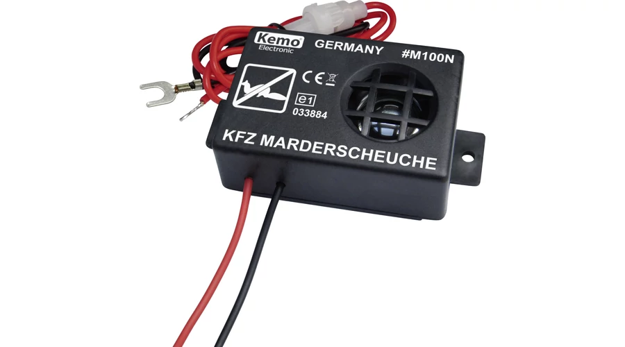 JELLEMZŐK: TÜV/GS certifikációval a 30 éves német KEMO Gmbh-tól. MADE IN GERMANY!! Védje autóját agresszív ultrahanggal. A nyesteket irritálja és távol tartja az autótól. A készüléket a motortérbe kell beszerelni. A kibocsátott ultrahangja emberek számára nem hallható. Jellemzők piezo ultrahang-tölcsér 150° lesugárzási szöggel Kontroll LED lámpa Műszaki adatok Frekvencia: kb 23 kHz Sugárzási szög: 150° Teljesítményfelvét: 2 mA Üzemi feszültség: 12 V/DC Üzemi feszültség 11-15 V DC (autó akkumulátor) Power On Soft-start, így a fedélzeti számítógép nem zavarja. Átlagos fogyasztás 2 mA Ultrahangos frekvencia mintegy 23 kHz. Szög 150 ° Hang: hangos pulzáló Hangszóró: Kerámia piezoelektromos ultrahangos hangszóró alumínium gömb. Visual elrettentő pulzáló LED Hőmérséklet tartomány körülbelül -25 és +80 ° C Biztosíték a biztosíték doboz F500mA Méret 72 x 50 x 28 mm (konzolok) Spikes Ellen védett feszültségcsúcsok a kínálat a 40 V (20 ms) CAN adatbusz alkalmas járművek CAN adatbus