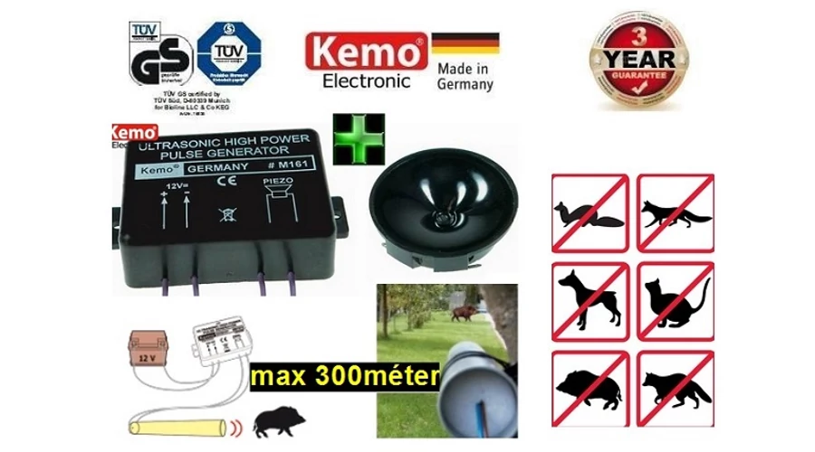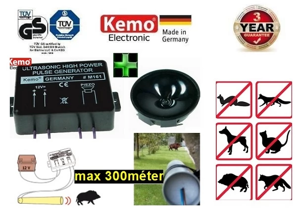 JELLEMZŐK: NÉMET KEMO m161 Nagy teljesítményű ultrahang impulzus generátor modul hangszóróval. Elűzi a vadon élő állatokat, mint a nyest, vaddisznó, szarvas, stb autó közeléből, kertek, mezők, stb. A mellékelt speciális hangszóró 5 másodpercenként robbanásszerű impulzus ultrahangot bocsát ki (max. 120 dB), amely egy kb 30cm hosszú 4cm átmérőjű ráhelyezett csővel (a szállítás nem tartalmazza) 300 m-es akusztikus hatótávot is elérhet, ami nagyobb kertben, vagy autóban igen hatásos lehet. A kb. 22.000 Hz-es ultrahangot az ember nem hallja meg. Műszaki adatok Üzemi feszültség 12-14,4 V / DC Áramfelvétel max. 150 mA Frekvencia mintegy 22 kHz (nem hallható az emberre) Frekvencia görbe Szinusz Impulzus időtartam 0,5 sec Impulzussorrend körülbelül 5 másodperc Kijelző LED villog, ha a hangszóró van csatlakoztatva impulzus Hangszóró kimenet piezo hangszóró Telejesítmény növeléshez még működtethető párhuzamosan összesen 2 db hangszóró, 1 hangszóró a tartozéka, a plussz hangszóró opcionális Méret 60x45x20 mm Hagszóró: 40mm átmérő Opcionálisan rendelhető L010 Piezzo hangszóró.