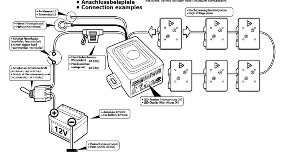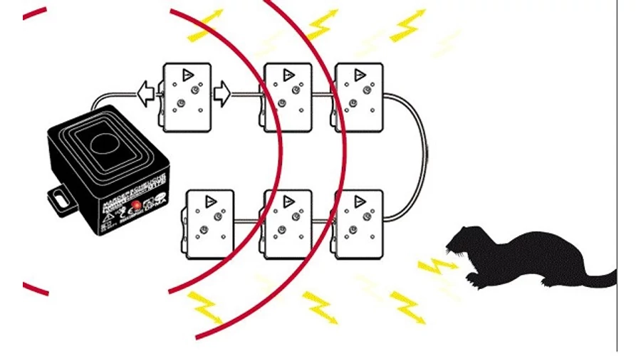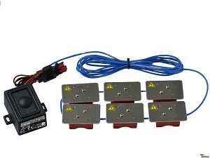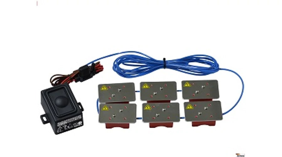 JELLEMZŐK: TÜV/GS certifikációval a 30 éves német KEMO Gmbh-tól. 12V nyest, mosómedve és menyétriasztó készlet. Három funkció tripla hatékonyság: Ultrahanggal + nagyfeszültségű lapokkal 200-300V DC (érintésre) + villogó fénnyel. teljesen vízálló kivitel!! IP65 Olyan ultrahangot bocsát ki, amely a nyestet, menyétet, mosómedvét stb.. elriasztja. Ha mégis betéved az állat az autóba, a nagyfeszültségű lapokon keresztül egy áramütést kap, ami nem végzetes, hanem elriasztó. Mindkét védelmi módszer veszélytelen az emberek és állatok számára. Akkumulátokímélő funkcióval rendelkezik. Tulajdonságok ultrahangos riasztás ( 15másodpercenként) Nagyfeszültségű lapocskák Fénnyle való riasztás Alacsony feszültségnél kikapcsol Akkumulátokímélő Ultrahangos hatótáv: 50m2 Ultra magas hangú hangot kombinál nagyfeszültséggel Védi a motortért nyesttől, menyéttől, mosómedvétől, egyéb rágcsálóktól VIDEO1 VIDEO2 Jellemzők: Vízálló 3 szoros riasztás: ultrahang, áramütést , pulzáló fény. A vezérlő egység hangszóró vízálló IP 65 Üzemi feszültség 12-15 V / DC (akkumulátor) Átlagos fogyasztás 5 mA Power On Soft-start, így a fedélzeti számítógépet nem zavarja. Kimeneti feszültség 200-300 V / DC Ultrahangos frekvencia körülbelül 22 kHz ? 10% SPL max. 100 dB ? 20% Ultrahang sugárzási szög körülbelül 160 ° Hangszóró Strukturális működtető, a tetején a ház rezgéssel (vízálló) Hang Sine, agresszív lüktető Hőmérséklet tartomány körülbelül -25 és +80 ° C Funkció kijelző villogó LED (körülbelül minden 5-12 sec) Kábelhossz nagyfeszültségű kábel 4 m Biztosíték a biztosíték dobozban F500 mA Nagyfeszültségű érintkező lemezek 6 db, állítható, egyenként körülbelül 62 x 42 mm Mérete az alapkészüléknak 40 x 50 x 70 mm (kábel nélkül + rögzítő láb) CAN adatbusz Alkalmas járművek CAN adatbusz. A készülék védve van a feszültség tüskék ellen az ellátási 40V (20 ms). IP65 vízállóság Nincs bejutó por, védett bármilyen irányú vízsugár ellen