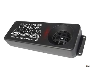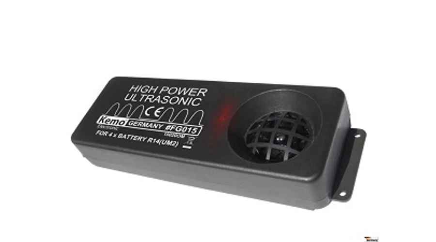 JELLEMZŐK: Német KEMO FG015 nagy teljesítményű ( 200m ) ultrahangos állasztriaszt, akár kültérre is. Elriasztja nyest, rágcsálók, vadon élő állatok, (a gépkocsi-beállók, padlásokon, lakóautók), vaddisznó, szarvas, stb (a kertek, mezők, stb.) A készülék termel hangos hatalmas, lüktető és agresszív ultrahang mintegy 21 kHz, de hallható, hogy a legtöbb ember a vadon élő állatok komoly kellemetlenségeket okoz, és így próbálja elkerülni azt. A berendezés 4 elem R14 (UM2) működtetett tartja minőségétől függően akár 8 hónapig. Műszaki adatok Hatótáv: max 200 méter Szerelés opció A falak és 4 csavarral Ø 3 mm (nem zárt) Elemek Működés 4 elem UM2 (R14, baby cella) nem tartalmazza Tápellátás jelzője a beépített LED, amely világít során a sugárzás a Ultraschalltons Gyűlés alkalmas kültéri telepítésre, de csak fröccsenő víz ellen védett helyen (eresz alá, a lombkorona, épült a kertben madár házak alatt a parkoló lakókocsi stb) Ultrahang frekvencia mintegy 21 kHz-es (± 10%) Működési ciklus 0,6 mp be, körülbelül 6 másodperc szünet Hangnyomás > 100 dB ± 15%-os (ultrahangos eszközök kell a hangnyomásszint meghaladja a 100 dB (C) elkerülése habituáció (ADAC teszt eredmény). Szög > 120 ° Hangszóró Speciális piezoelektromos ultrahangos nagy teljesítményű hangszórók lakkozott (vízálló) membrán Akusztikus tartomány > 200 m Üzemi feszültség 6 V / DC (4 x UM2 elem) A jelenlegi felvételi szünet mintegy 0.005 mA Fogyasztás aktív 5 mA Tesztelt hőmérséklet tartomány -15 ° C-tól +60 ° C-on méretek 190 x 70 x 33 mm H x Sz x M