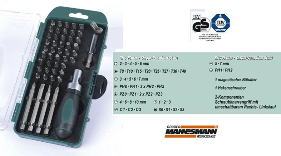 JELLEMZŐK: 10 év garancia TÜV/GS certifikációval. Minőségi termék a 80 éves legendás német MANNESMANN WERKEZEUGE "Green Line" ipari minőségű TÜV-GS + DIN-ISO, professzionális kategóriájából 10 év garanciával. 49 darabos CRO-VA hagyományos és speciális betétek a legújabb készülékek javításához is. Racsnis, kétkomponensű csavarhúzóval Több eltérő szabvány szerinti fej minden szokásos akkus stb. csavarhúzóhoz alkalmazható mágneses és mechanikus rögzítésű toldók, átalakítók 25mm: 2 o 3 o 4 o 5 o 6 mm T8 o T10 o T15 o T20 o T25 o T27 o T30 o T40 3 o 4 o 5 o 6 o 7 mm Ph0 o Ph1 o 2 x Ph2 o Ph3 Pz0 o Pz1 o 2 x Pz2 o Pz3 4 o 6 o 8 o 10 mm 1 o 2 o 3 c1 o c2 o c3 S0 o S1 o S2 o S3 75mm 5 o 7 mm Ph1 o Ph2 1 magnetischer Bithalter 1 hakenschrauber 2-Komponenten Schraubknarrengriff mit umschaltbarem rechts- linkslauf