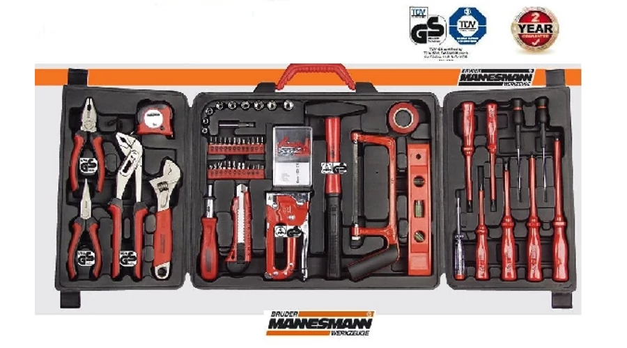 JELLEMZŐK: 2 év garancia TÜV/GS certifikációval Minőségi termék a 80 éves legendás német MANNESMANN WERKEZEUGE-től. VPA/GS tesztelt univerzális háztartási szerszám klt. 60-részes, Háztartásban az olykor leginkább szükségszerű szerszámok remek egyvelege megfizethető áron. 60-tlg. Í die gebräuchlichsten Qualitätswerkzeuge für den Haushalt im praktischen Aufbewahrungskoffer Í für Wandmontage geeignet Í 1 x Profi-Kombizange 6? 1 x Profi-Telefonzange 6?, gerade 1 x Profi-Wasserpumpenzange 10? 1 x Rollgabelschlüssel 8? 1 x Bandmaß, 3m 1 x Schraubknarrengriff 1 x Tacker 9 x Stecklüsseleinsätze 5-13mm 23 x Bits 1 x Adapter von 1/4? auf Sechskant 1 x magnetischer Bithalter 1 x Schlosserhammer, GS-geprüft 1 x Schlosserhammer, GS-geprüft 1 x Bügelsäge 1 x Universal-Messer 1 x Rolle Universal-Klebeband 1 x Torpedo-Wasserwaage 1 x Spannungsprüfer, GS- geprüft 6 x Elektro-Schraubendreher, GS- geprüft 2 x Feinmechaniker-Schraubendreher 1 x Sortiment aus Schrauben, Dübeln, Nägeln und Tackerklammern