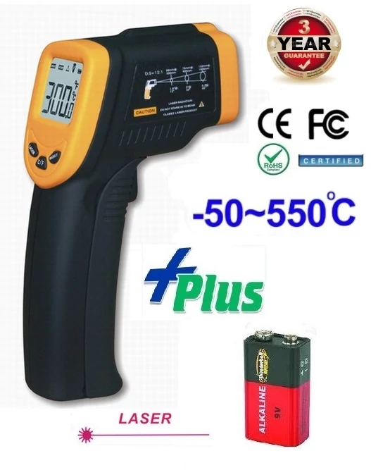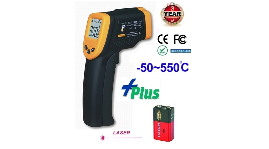 JELLEMZŐK: Hőmérséklet tartomány: -50 ~ 550 C (-58 ~ 1022 F) Pontosság: 1,5% vagy 1,5 C Ismétlőképesség: š 1% vagy š 1 Távolság Spot arány: 0:01 Emissziós: 0.95 előre Felbontás: 0,1 / Válaszidő: 500 ms hullámhossz :8-14žm C / F kiválasztása Data Hold funkció Lézer Pointer Cél ON / OFF kiválasztása Háttérvilágítás ON / OFF kiválasztása Automatikus kikapcsolás 7 másodperc tétlenség Tápfeszültség: 9V-os elem (nem tartozék)