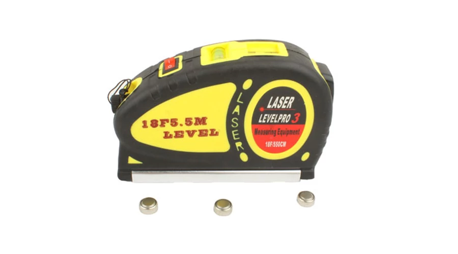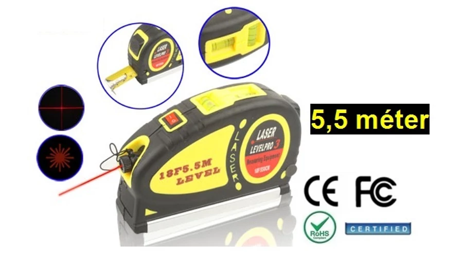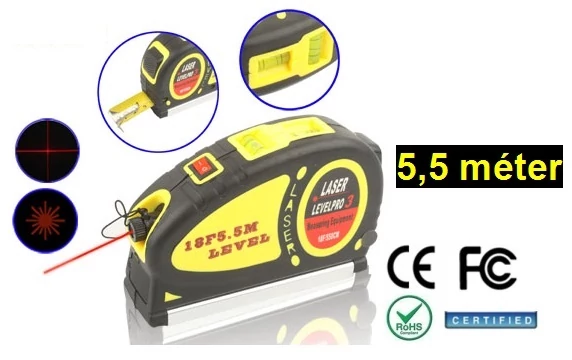 JELLEMZŐK: 1 év garancia 1) Mérőszalag 5,5 méter, a lézer fény 18 méter 2) Lézeres vetítés: Piros pont / lézerfény 3) 2db buborék vízmérték 4) Lézer hullámhossz: 630-680nm piros színű 5) Lézer teljesítmény: <5mW 6) Anyag: gumi felület 7) Szalag rögzítés / feloldás gomb 8) Lézer Be / Ki gomb 9) Lézer projektor táp ellátása 3db AG13/LR44 gombelem (tartozék) 10) Méret: 13.8x8.7x3.8cm