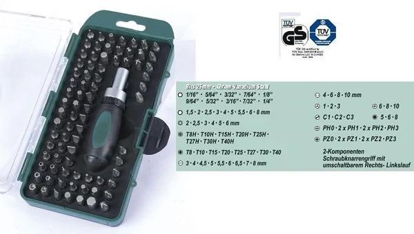 JELLEMZŐK: 10 év garancia TÜV/GS certifikációval. Minőségi termék a 80 éves legendás német MANNESMANN WERKEZEUGE "Green Line" ipari minőségű TÜV-GS + DIN-ISO, professzionális kategóriájából 10 év garanciával. 79 darabos CRO-VA hagyományos és speciális betétek a legújabb készülékek javításához is. Racsnis csavarhúzóval, két komponensű nyéllel Több eltérő szabvány szerinti fej minden szokásos akkus stb. csavarhúzóhoz alkalmazható mágneses és mechanikus rögzítésű toldók, átalakítók 25mm: 1/16" o 5/64" o 3/32" o 7/64" o 1/8" 9/64" o 5/32" o 3/16" o 7/32" o 1/4" 1,5 o 2 o 2,5 o 3 o 4 o 5 o 5,5 o 6 o 8 mm 2 o 2,5 o 3 o 4 o 5 o 6 mm T8h o T10h o T15h o T20h o T25h o T27h o T30h o T40h T8 o T10 o T15 o T20 o T25 o T27 o T30 o T40 3 o 4 o 4,5 o 5 o 5,5 o 6 o 6,5 o 7 o 8 mm 4 o 6 o 8 o 10 mm 1 o 2 o 3 6 o 8 o 10 c1 o c2 o c3 5 o 6 o 8 Ph0 o 2 x Ph1 o 2 x Ph2 o Ph3 Pz0 o 2 x Pz1 o 2 x Pz2 o Pz3 2-Komponenten Schraubknarrengriff mit umschaltbarem rechts- linkslauf