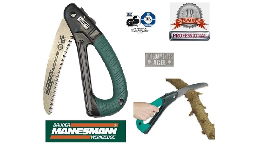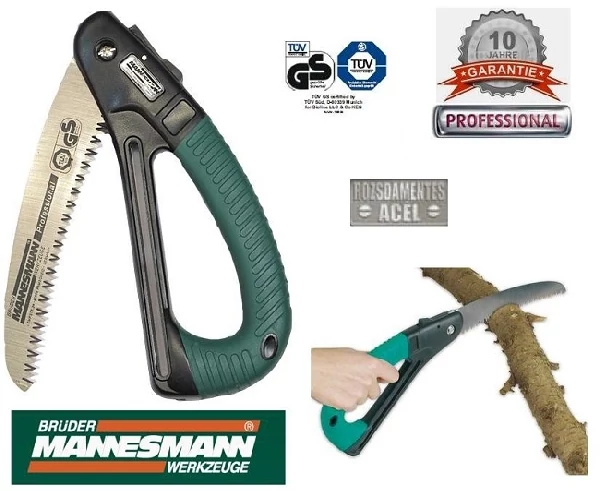 JELLEMZŐK: 10 év garancia TÜV/GS certifikációval. Minőségi termék a 80 éves legendás német MANNESMANN WERKEZEUGE "Green Line" ipari minőségű TÜV-GS + DIN-ISO, professzionális kategóriájából 10 év garanciával. Praktikus zsebben is elférő (bicska jellegű) szerszám, mini fűrész, ágvágó. Professzionális minőségű, keményített szerszámacél, hajlított fűrészlap. A fűrészlap minőségi, edzett szerszámacélból. Köszörült és különlegesen edzett fogak; nedves és száraz fához egyaránt alkalmasak. Biztonsági nyomógomb véd a penge véletlen be- és kipattanása ellen. Fűrészlap hossz 180 mm Ergonómikus, jól kézben tartható markolat csúszás-visszatartó puha kuplung Fogak: 3 soros fényezett és extrém keményített Alkalmas friss és száraz fára egyaránt. Biztonságizáras fogantyú. A penge nem csukódik vissza munka közben. Gebogenes Sägeblatt aus hochwertigem, gehärtetem Werkzeugstahl Blattlänge ca. 180 mm, Rutschhemmender Softgriff Zähne dreifach auf Zug geschliffen und gehärtet, für frisches und trockenes Holz geeignet Sicherheits-Sperrklinke gegen unbeabsichtigtes Ein- und Ausklappen des Sägeblattes