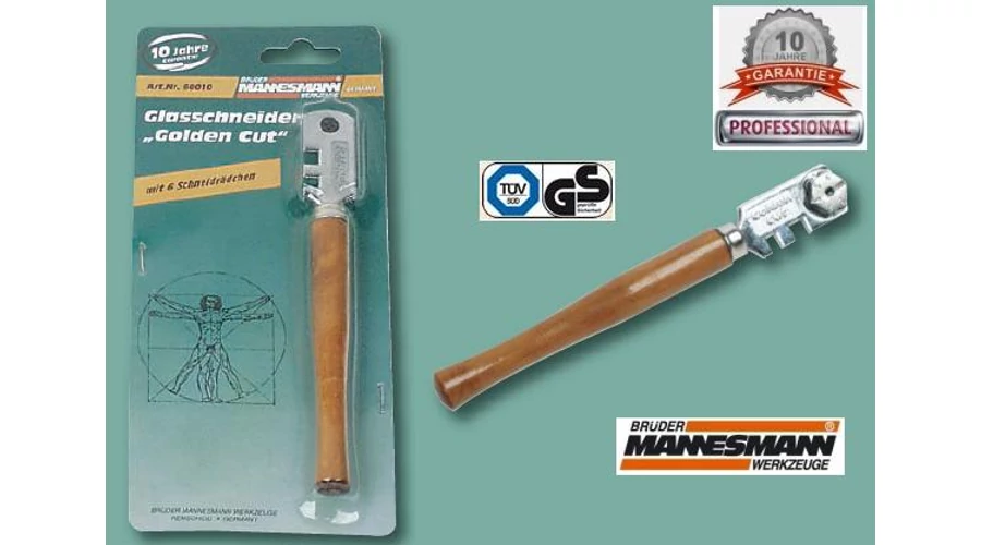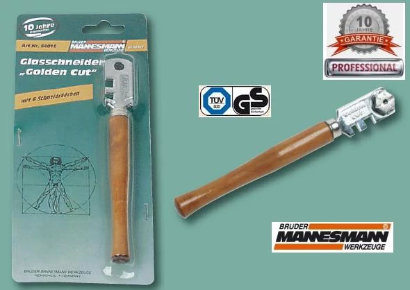 JELLEMZŐK: 10 év garancia TÜV/GS certifikációval. Minőségi termék a 80 éves legendás német MANNESMANN WERKEZEUGE "Green Line" családból. ÜVEGVÁGÓ 6 FEJJEL, FA NYÉLLEL, ÜVEGFOGÓVAL Glassschneider "Golden Cut" incl. 6 Hartmetallschneidrädchen
