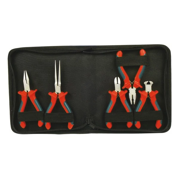 Kis méret a szűk, nehezen hozzáférhető helyen történő munkavégzéshez. Kiváló minőségű acélból készült fogó, korrózióvédő felületkezeléssel. Kiváló minőségű műanyagból készült, ergonómikus kialakítású, lágy TPR csúszásgátló gumival ellátott markolat. Vászon tartó. kombinált fogó 115mm, oldalcsípő fogó 115mm, homlokcsípő fogó 105mm, rádiós fogó 125mm,hosszú csőrű fogó 125mm
