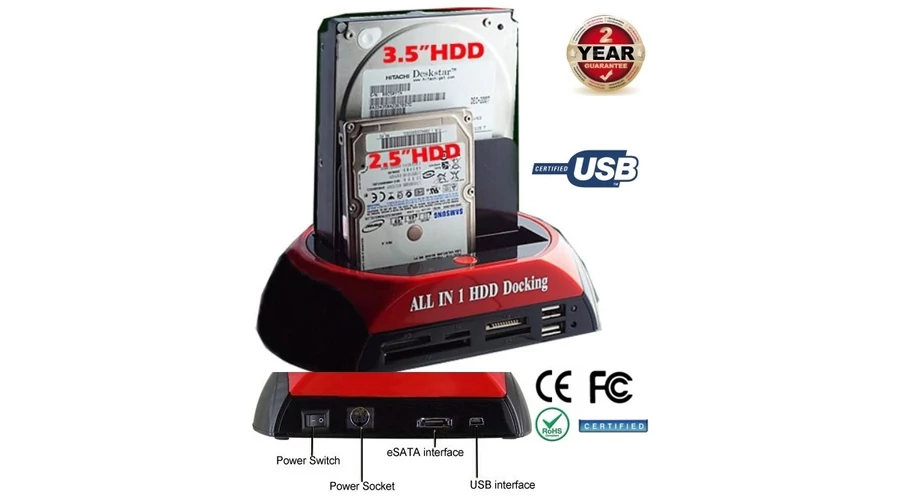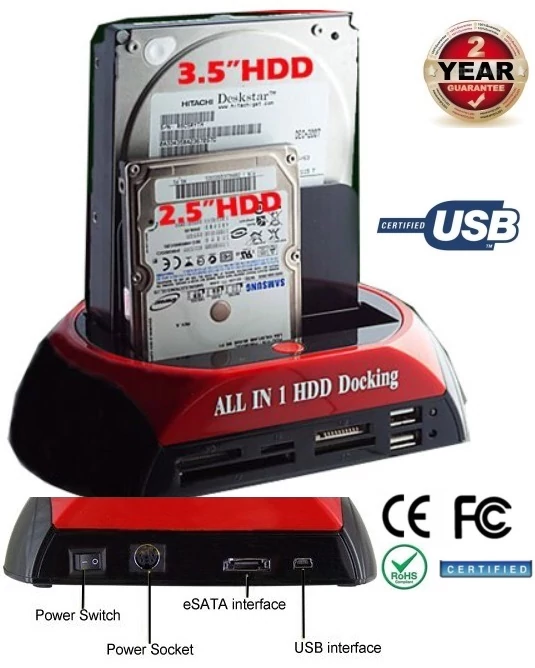 JELLEMZŐK: 1) A számítógép kompatibilis USB és e-SATA-alapú asztali PC vagy notebook / Mac 2) HDD Multi-funtion Dock az egy gombbal mentés 3) A nagy sebességű merevlemez klónozása (lehet offline) 4) A DC csatlakozó 6 pin, kérjük, használja a gyár nyújtott teljesítmény 5) kártyaolvasó támogatja a legtöbb népszerű formátumot memóriakártyák 6.) Támogatja az összes 2.5 "/3.5" SATA és 2.5 "/3.5" IDE merevlemez minden kapacitás USB perifériák 7) Támogatás hot cserélhető 8) A One Touch Backup funkció 9) Jellemzők 2-portos USB 2.0 hub 10) A nagy sebességű USB 2.0 akár 480Mbps adatátviteli sebesség (USB 1.1 visszafelé kompatibilis) 11.) Jellemzők XD / CF / TF / SD / MS kártyaolvasó és eSATA port 12.) Kompatibilis SATA I, SATA II, SATA II adatátviteli sebesség akár 3 Gb / s 13) Méret: 175 x 110 x 75 mm VIDEO: https://www.youtube.com/watch?v=7qTauT9bDgw Egyéb Érthető, kényelmes és trendi design SATA I és SATA II kompatibilis SATA II adatátviteli sebesség akár 3 Gb / s, USB 2.0: akár 480Mbps Támogatja a dual 2.5 / 3.5 SATA merevlemez-meghajtó, bármilyen kapacitással Támogatja eSATA átviteli sebesség akár 3Gbps Támogatja az USB 2.0 átviteli sebesség akár 480Mbps One Touch Backup funkció Dugók és játszik, és hot-swap LED állapot-kijelzője 64 in 1 kártyaolvasó: CF Slot: CF-I / CF-II / Extreme CF / Extreme III CF / Ultra II CF / HS CF / MD. MS Slot: MS / MS DUO / MS PRO / MS PRO DUO / MS MagicGate / MS MagicGate PRO / MS MagicGate DUO / MS MagicGate PRO DUO / Extreme MS PRO / Extreme III MS PRO / Ultra II MS PRO / HS MS MagicGate PRO / HS MS MagicGate PRO DUO / MS ROM / MS Select. SD Slot: SD / Mini SD / Extreme SD / Extreme III SD / Ultra II SD / MMC 1 / MMC 2 / MMC 4.0 / RS MMC / HS RS MMC / Micro SD (T-Flash). X-Momery Slot: X-memória. A csomag tartalma: dokoló, USB kábel, töltő, hálózati kábel, ( nem tartozékok: winchester, mem. kártya, pendrive)
