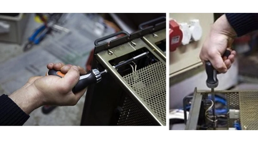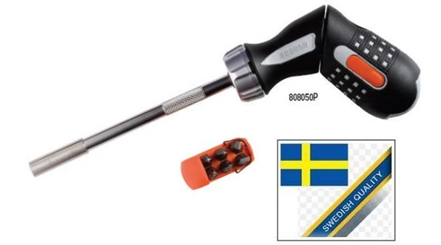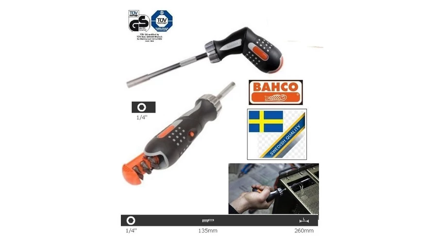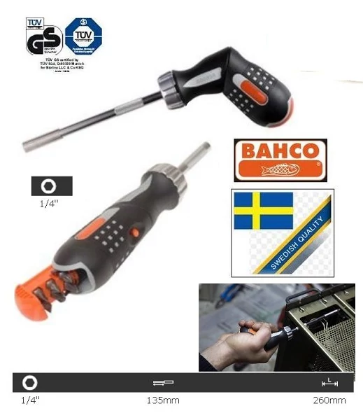 Cégünk a svéd BAHCO szerszámok közvetlen importőre. Viszonteladóknak kedvezmény JELLEMZŐK: 5 év garancia (a gyártási hibára visszavezethető probléma) BAHCO RACSNIS BITBEHAJTÓ ELFORDÍTHATÓ NYÉLLEL TÁRRAL + 6DB BITTEL R. SZÁM: 808050 P Egyéb: Ratschen-Schraubendreher mit Pistolengriff. 1/4" Bit-Ratschenschraubendreher mit Pistolengriff 3-Komponentengriff für komfortable Handhabung und minimalen Krafteinsatz Per Knopfdruck schwenkbarer Griff von Normalposition auf 30°, um eine höhere Kraftübertragung insbesondere in beengten Einsatzgebieten zu ermöglichen Rastet automatisch auf 180° Normalposition ein Mit integriertem Bit-Magazin im Griff, öffnet durch Knopfdruck Sichere Aufbewahrung von 6 verschiedenen Bits in den Größen: Schlitz 4.5, 5.5, PH-1, PH-2, PZ-1, PZ-2 Einfacher Bit-Wechsel dank magnetischem Schaft Geriffelte Schaft-Oberfläche zur einfachen Handhabung Einfacher Richtungswechsel (links, rechts und fixiert) durch kurze Drehung des Umschaltrings Grösse: 230mm Gewicht: 230g