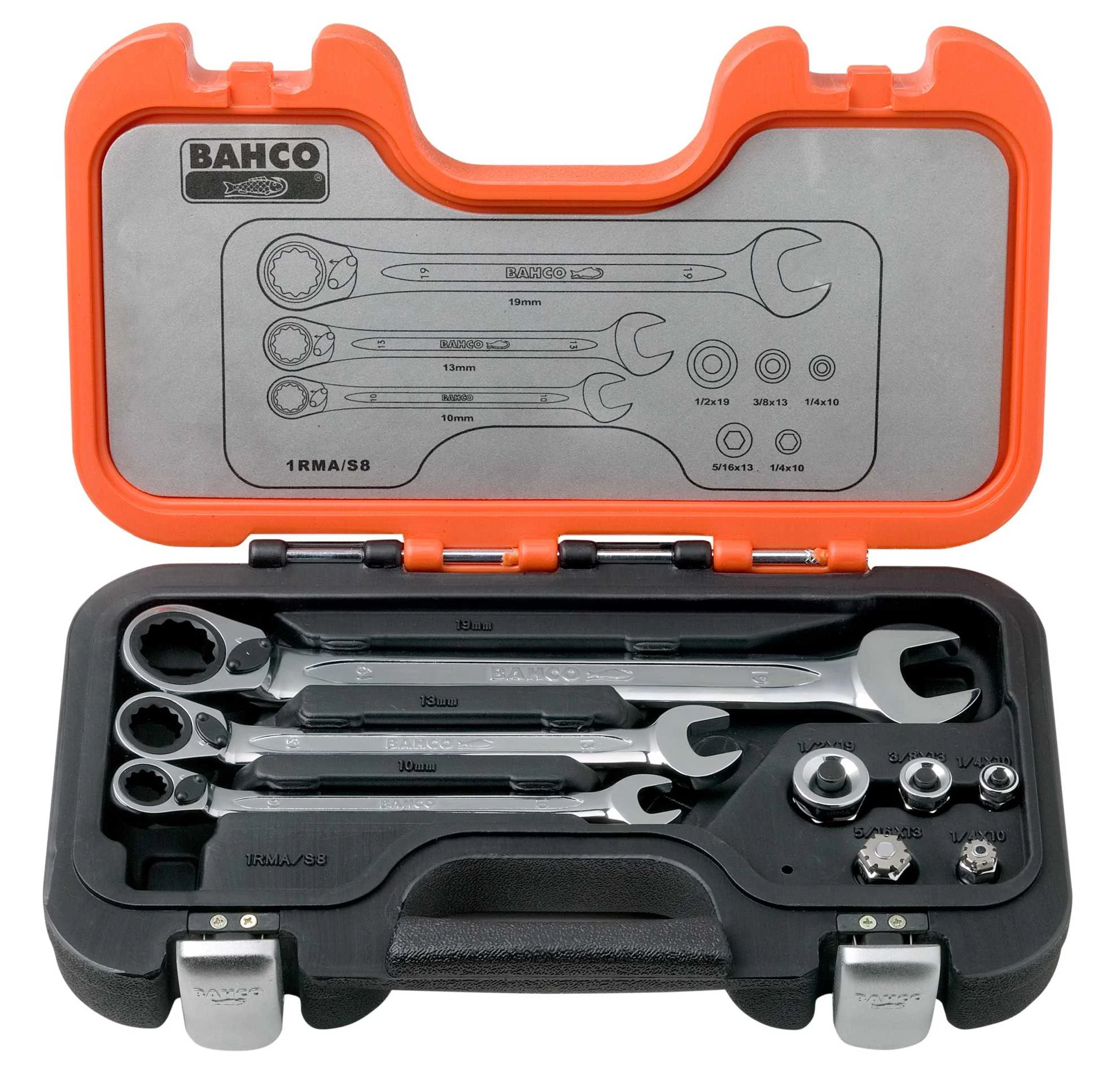 Ratcheting wrenches 1RM-10 ,-13, -19 with 5° ratchet action, reverse lever and 15° offset