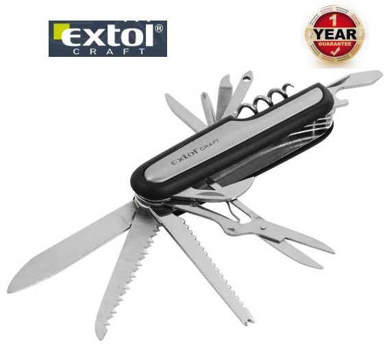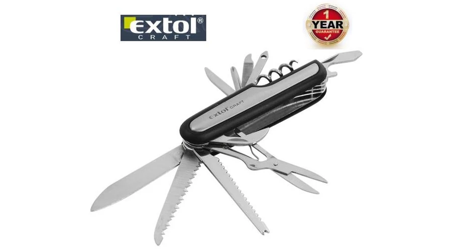 JELLEMZŐK: 1 év garancia EXTOL CRAFT 11 az 1-ben MULTIFUNKCIÓS ZSEBKÉS SZERSZÁMKÉSZLET, Hasznos és tartós kemping kés. Multifunkciós 11 különböző szerszám, többek között fűrész, csavarhúzó, nyitó, kés, olló, és reszelő része ennek a bicskának. Fém és műanyag kombinálásával készült zsebkés markolata Műszaki adatok Anyag HRC 42 acél