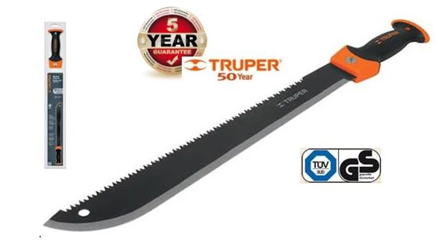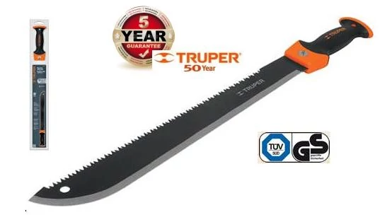 JELLEMZŐK: 5 év garancia TÜV/GS DIN ISO certifikációval. Minőségi termék az 50 éves TRUPER-től. Különleges egyedi kialakítású kétélű bozótvágó. A penge karbonacél, kétszeresen hőkezelt, rozsdamentes, rezgésmentes. Nyél anyaga ABS, kétkomponensű a biztos és a jó kézbentarthatóság érdekében. Az él felső íve fűrész, a másik pedig éles penge. 46 cm él,erősített,új forma csúszásmentes markolat Teljes hossza: 60cm